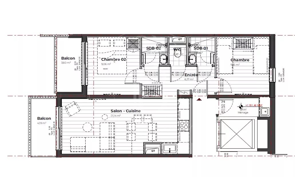 Le Fontany 203+204 — Renovated 2 bedroom apartment of 46,89 sqm (Carrez) in Méribel-Mottaret, ski-in / ski-out.